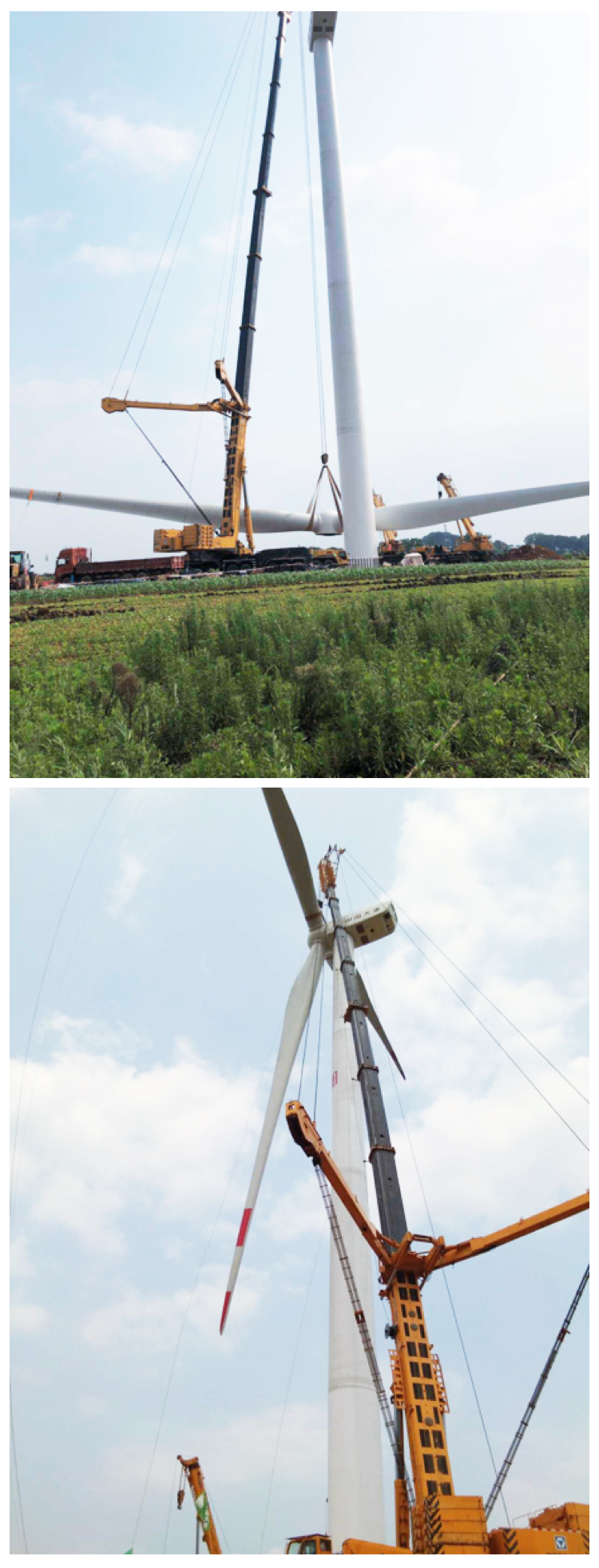 我方选用徐工QAY1000T作为主吊,徐工75T和长江70T作为辅吊,主吊于5月1日在39#机位开始组车,5月3日主吊组装完成,因当地气候原因,正处于雨季,机位平台因雨水浸泡处于松散泥泞状态,吊车在平台行走和支车艰难,为确保现场施工顺利进行,项目部积极对施工现场人员配备、材料需求、机械需求等方面进行全面梳理,实时掌握施工过程中总体情况,确保现场进度实现可控、能控、在控。我方克服种种困难仅用4天时间于5月13日顺利完成首次风机吊装。